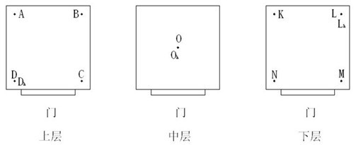 在被恒溫恒濕試驗箱工作室內定出上、中、下三個水平層面(簡稱上、中、下三層),上層與工作室頂面的距離是工作室高度的1/10,中層通過工作室幾何中心點O,下層在底層樣品架上方10mm處。