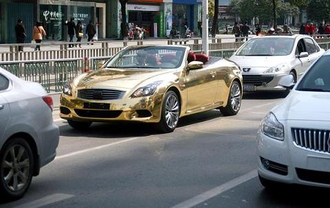 2011年3月29日,在南京新街口,一輛車(chē)身貼滿(mǎn)黃金的“黃金跑車(chē)”停在馬路邊上,車(chē)主停好車(chē)后隨即離去,過(guò)了約10分鐘,車(chē)被交警以違停拖走。