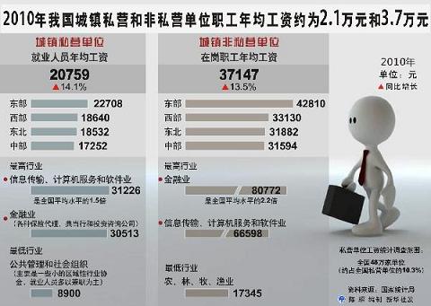 國家統計局的數據顯示,2010年全國城鎮非私營單位在崗職工年平均工資為37147元,比上年增長13.5%,增幅提高1.5個百分點。
