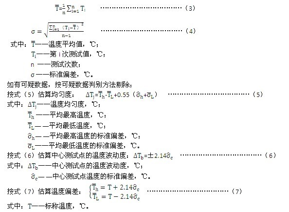 根據每次測得的溫度,按式(3)和式(4)計算中心測試點溫度的算數平均值和標準偏差: