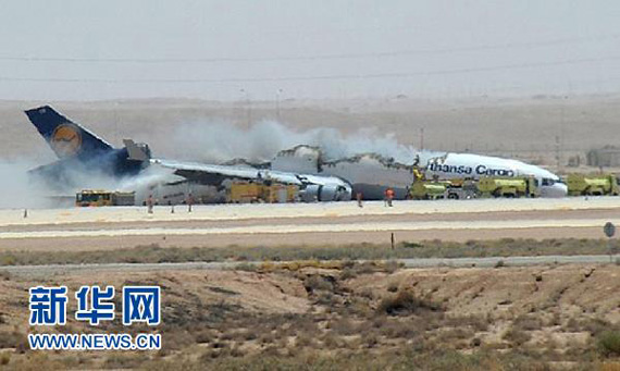 這張手機(jī)拍攝的照片顯示,德國漢莎航空公司一架貨機(jī)7月27日在沙特首都利雅得的哈立德國王國際機(jī)場墜毀。據(jù)阿拉伯衛(wèi)星電視臺援引沙特民航局官員的話說,貨機(jī)駕駛員和副駕駛員已經(jīng)被送往醫(yī)院搶救。目前尚不清楚貨機(jī)上具體人數(shù)。